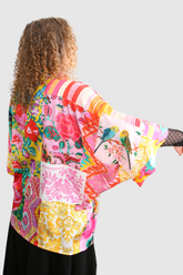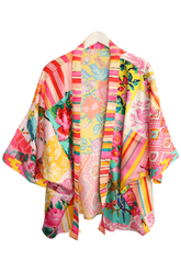 A coastal colour scheme of turquoise and warm saffron, this beachy kimono is a printed with a collection of exotic tribal embroideries gathered on Anna’s travels through exotic lands. A suzani from Uzbekistan, a fragment of ikat from the Grand Bazaar. Treasures from history are woven together to create a timeless piece of wearable beauty.