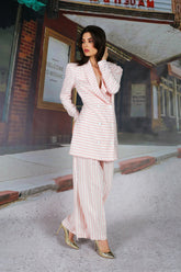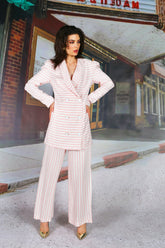 Designed in the ‘STRIPE DREAM’ pink and white stripe with side splits, fly front and front pleats for the perfect tailored fit.