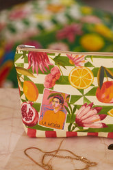 The Life In Colour travel purse is not only practical but also stylish. It features beautiful illustrations of fresh fruits on contrasted abstract green gingham, making it a true work of art. The unique design is sure to turn heads and add a touch of colour to your travel style.