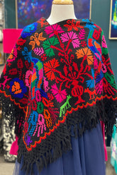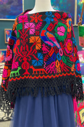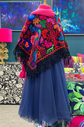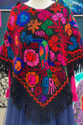 Hand woven and hand cross-stitched poncho with macramé tassel trim.