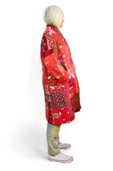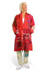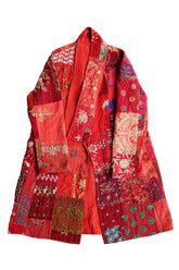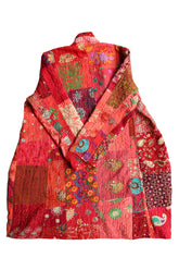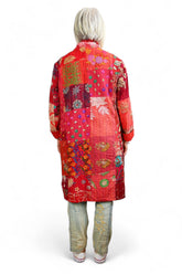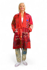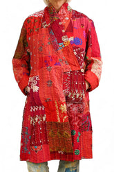 Our beautiful Maharani Coats are one of a kind. Each coat has been created from a collection of divine vintage embroidered Silk and cotton saris pieced together. They are backed in plain cotton which has been quilted with rows of stitches (kantha work).