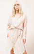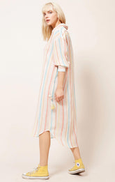 Long open cotton colourful striped dress with long sleeves and a belt to mark the waist.