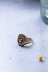 Unpolished for a rustic and antique feel. Bronze finish. Heart detail
