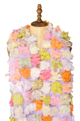 Beautiful hand crocheted linen scarf with pastel fabric floral motifs. Soft lavender base colour. Sophie has been described as a master colourist, evident in the beautiful hand-dyed shades in this piece.