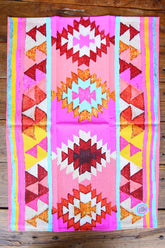Mystical and magical Mojave is a vibrant tribal-influenced print inspired by the famous woven blankets of New Mexico. Pink and apricot, a flash of bright aqua and mustard yellow are softened by the addition of earthy shades of terracotta and burnt sienna.