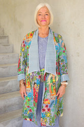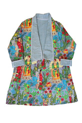 Kantha work is the layering together of vintage sari fabrics which are then hand stitched together in wonderful, colourful arrays. Each coat is backed in vintage fabrics which are quilted with rows of stitches (kantha work).