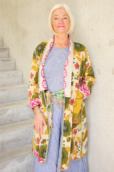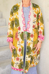 Vintage patchwork hand stitched one off Kantha coat. Featuring soft cotton fabric in vibrant pink, green and yellow floral pattern. Deep side pockets.