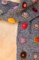 Delicious velvet buttons decorate this crochet scarf in an array of colours from lilac, red and olive to name but a few! Sophie has been described as a master colourist, evident in the beautiful hand-dyed shades in this piece. The multitudes of shades within this scarf lends itself to be styled in so many different ways.
