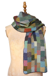 This is such a unique scarf in that it is double sided. One side is a landscape of various coloured rectangles and the reverse side is a tactile lattice work of charcoal; it's like two scarves in one! Sophie has been described as a master colourist, evident in the beautiful hand-dyed shades in this piece.