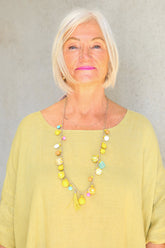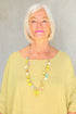 This piece features hand-painted beads mixed with resin, strung on cotton cord and finished with a tassel.