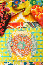 Anna has spent a lifetime collecting scraps of vintage fabrics from flea-markets inspiring this mix of vibrant orange, yellow and green patterns from the seventies re-worked into a groovy patchwork.