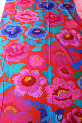 Hot pink and electric blue roses are embroidered onto a vibrant orange/red background, with turquoise bluebirds swooping happily amongst the blooms. Optimistic and uplifting with a timeless flavour, a jolt of pure uninhibited colour and joy.