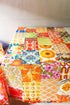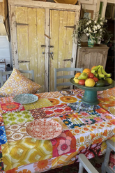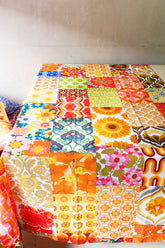 Anna has spent a lifetime collecting scraps of vintage fabrics from flea-markets inspiring this mix of vibrant orange, yellow and green patterns from the seventies re-worked into a groovy patchwork.