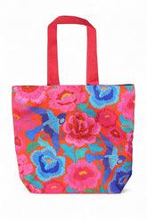 Hot pink and electric blue roses are embroidered onto a vibrant orange/red background, with turquoise bluebirds swooping happily amongst the blooms. Optimistic and uplifting with a timeless flavour, a jolt of pure uninhibited colour and joy.