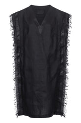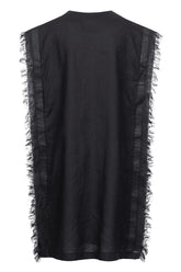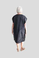 Capped sleeves with fringes and leather strips that run along the front and back of the dress down to the hem