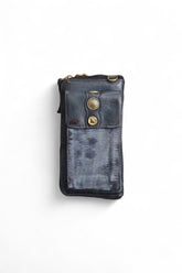 Made using white raw leather, then dip dyed and tumbled to achieve a weathered effect – this leather will soften with wear. All marks are natural markings on the leather which is picked up by the dye.