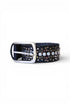 Black leather belt 35mm wide with studed pearl outer. Polished silver buckle.
