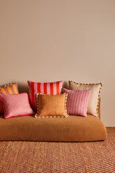 Inspired by the sweet tones of summer, this linen cushion pairs soft pink and orange in a retro stripe. Playful yet versatile, it works beautifully with both florals and solids.