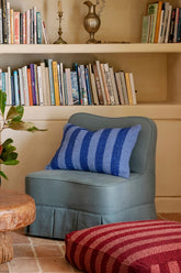 Hand loomed from textured boucle the Boucle Stripe Blue Cushion is contemporary and cosy. Featuring bold stripes in deep ocean shade, this blue boucle cushion is the perfect pairing for coastal-inspired patterns and seaside stripes in the bedroom or lounge room.