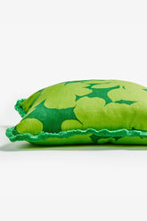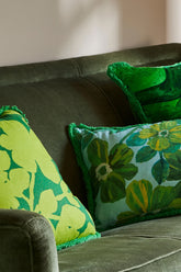 Embrace vintage aesthetics with big, bold flowers influenced by seventies wallpaper designs. The Carmine Lime Cushion celebrates the simplicity of these oversized printed with a reverse shade technique. Finished with a thick green fringe trim, this lime green floral cushion will shine on your sofa or on banquette seating amongst bold stripes and textured cushions.