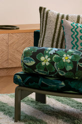 Our Cosmos Green Bolster 60cm x 20cm cushion features original artwork by Bonnie printed on white linen.
