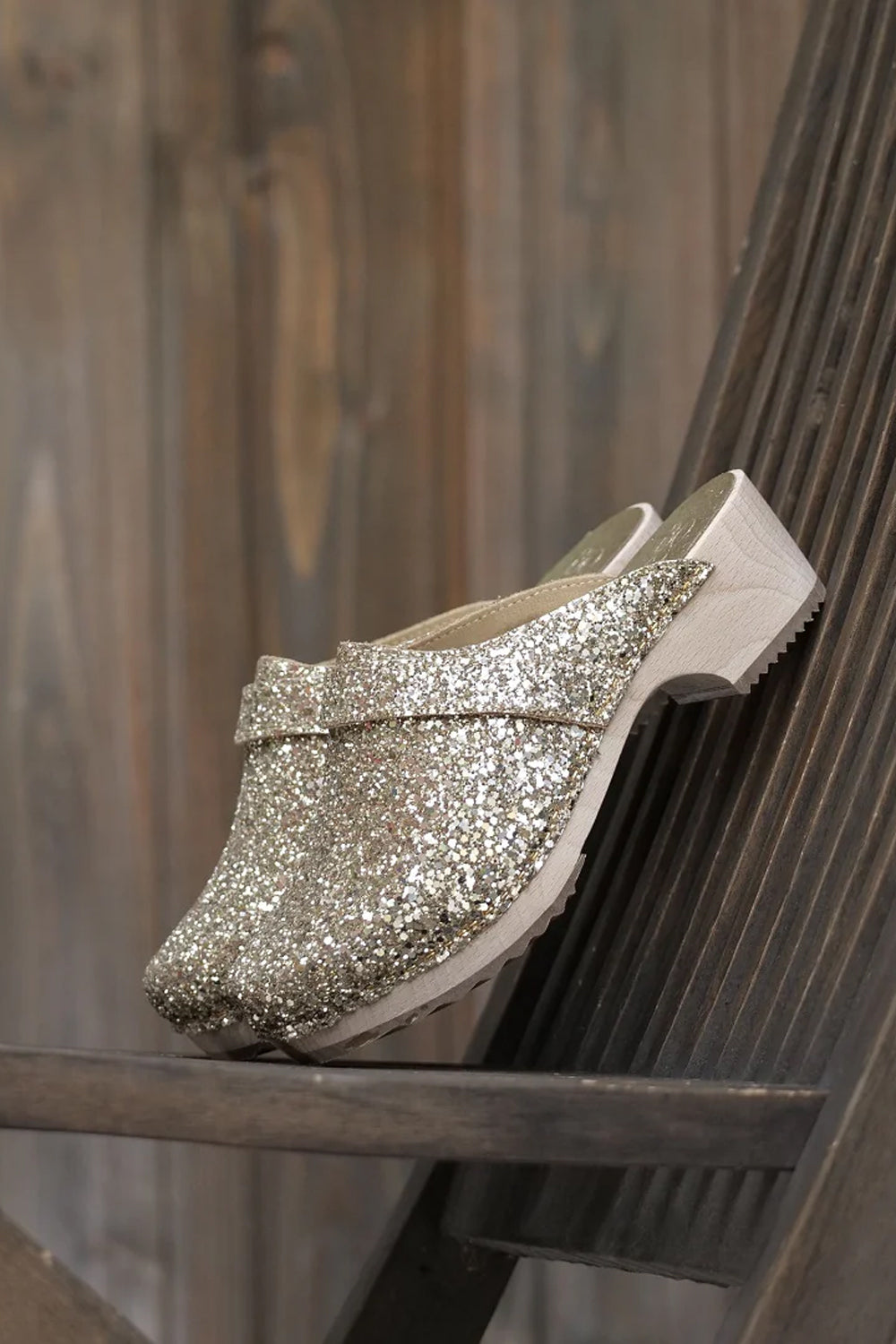 The dazzling Camilla clogs and their glitter uppers are a perfect, flashy addition to any look. Suitable for every occasion, these clogs check all the boxes for both comfort and style. Their traditional wood soles give you excellent comfort and a feminine vibe.