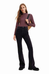 This fun long sleeved body suit has a retro feel thanks to the geometric print. Pair it with a retro flare pant for a total look.