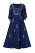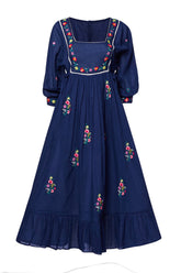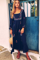 Gorgeous Navy Blue long dress with hand embroidered flowers on the bodice and skirt. This cotton dress has 3/4 cuffed sleeve and features a blanket stitch neckline. With ties at the waist to adjust fit.