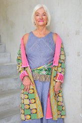 Kantha work is the layering together of vintage sari fabrics which are then hand stitched together in wonderful, colourful arrays. Each coat is backed in vintage fabrics which are quilted with rows of stitches (kantha work).