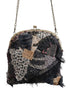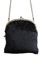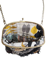 Little Black Number is set for an exciting time accompanying an outfit of glamour and style. It is made from a collage of beautiful black, gold and dusky pink fabrics giving a luxurious and elegant look to this one-off handbag. It is stitched with contrasting threads interspersed with Bohemian glass beads. The decorative frame is a brass colour and sprinkled with pink and black Bohemian glass beads. The clasp has two diamantes and there is a removable shoulder chain so that the Little Black Number can suit any occasion.