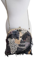 Bespoke, hand stitched patchwork handbag with detachable chain and matching earrings. Each bag is created using small pieces of treasured fabrics and upcycled clothing collected over time. Artists Ann Rattey and Jo Day use the process of reclaiming, reworking and renewing, to create unexpected and unique wearable artworks.