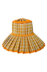 Sundeck features milk white and butter yellow alternating thread colours woven through its striped natural and sunshine yellow hand-dyed fibre base, with a marigold fabric trimming and a houndstooth inspired pattern.