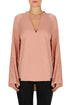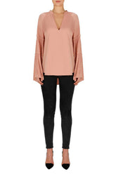 Feel like a rock star with these incredible sunpleat sleeves! Made from a fluid silk-satin, this piece features sharp pleats that have been thoughtfully placed around the band collar and sleeves to create a true elegant shape.