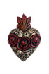 Hand carved and painted wooden heart with roses and decorated with bronze Milagro "miracle" charms.