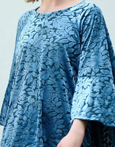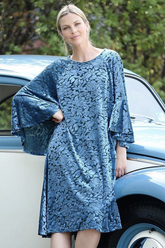 The most divine batwing-sleeve in luxurious velvet burnout floral in "high octane" blue with forrest green base. This knee-length dress falls beautiful. With a key hole button closure at back. Elegant and comfortable, this versatile dress works with both boots and heels, taking you from day to night.