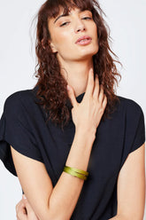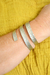 Monica Krexa's bracelets are made in Brazil and crafted from lightweight recyclable anodized aluminium that has been bent to create a textured thick design. Bracelets are adjustable.