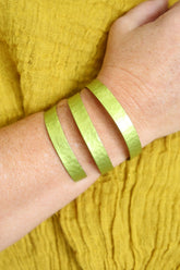 Monica Krexa's bracelets are made in Brazil and crafted from lightweight recyclable anodized aluminium that has been bent to create a textured thick design. Bracelets are adjustable.
