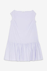 Cap-sleeve poplin mini dress with boat-neck and ruffled hem.