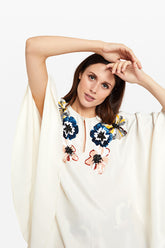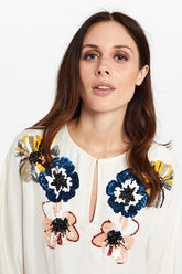 This gorgeous flared top with hand embroidered sequin flowers will have you feeling like a rockstar. With key-hole neckline. Pair with slim-line trousers or jeans.