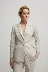 This single button front blazer with cupped rounded shoulders, narrow lapel line and elegant hidden-inseam side pockets is "the perfect fit" blazer. Multi-panel front along with elegant, fitted darts on the front, delicately positioned seams in the back for a perfect shape. The carefully crafted cuff opening allows for the cuff to be worn down or folded back like a French cuff. The ultimate statement staple to wear over a casual outfit or a specialty evening dress.