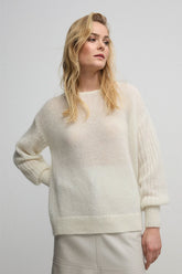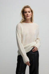 The Sloan knit is a soft supple “fluffy” yarn knit that is a delight to wear. The intricate texturing on the sleeve catches the eye while the Mohair and Australian Merino Wool blended yarn makes it surprisingly light weight. Tuck the bottom hem ribbing up for a ‘boyfriend’ look, or wear it down to create a more fitted tunic-like look. The wider boat-neck collar cut allows for the garment to be worn layered if you wanted to wear that favourite shirt or blouse underneath or versatile enough to be worn off-the-shoulder if that more your look. The cut is relatively relaxed so if you prefer a more tailored look we recommend going down a size.