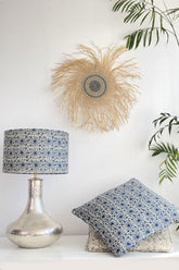 Blue/Grey linen cushion with atlas print motif. Envelop zipper closure.