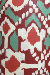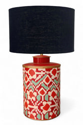 Boho luxe tin lamp base, with hand painted batik-inspired pattern in red, with white and mint pattern and finished with antique gold paint trimmings