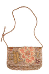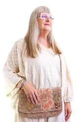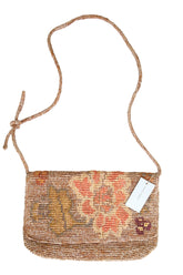 Hand crocheted raffia bag with hand cross-stitched blossoming flowers in delicious shades of brown, yellows, peach and neutrals. With an internal pocket this bag has ample space for all of life's essentials. Sophie has been described as a master colourist, evident in the beautiful hand-dyed shades in this piece.
