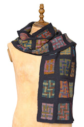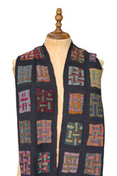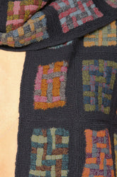 An intricately crocheted fine wool scarf featuring multi-coloured checkerboard pattern repeated in grids. The colours of this piece are so divine. Sophie has been described as a master colourist, evident in the beautiful hand-dyed shades in this piece.