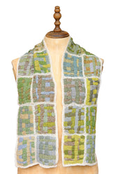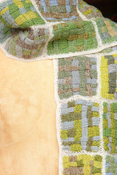 Precision-made patchwork woven scarf in vibrant shades of green, browns and blues, let your imagination run wild with this beautiful linen crochet scarf. The colours of this piece are so divine. Sophie has been described as a master colourist, evident in the beautiful hand-dyed shades in this piece.