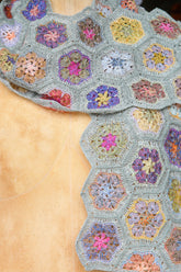 An intricately crocheted openwork scarf in fine wool, accented with floral circles at the centre. The colours of this piece are so divine.