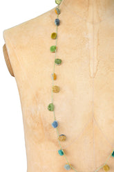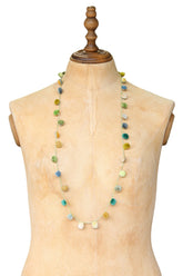 Shades of green and blue make up this beautifully hand crocheted linen pom-pom necklace. Each ball is unique, with a alternative colour reverse.
