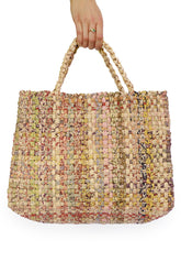 Hand crocheted raffia bag with multi coloured pastel woven lattice design in delicious shades from soft pinks and peaches to soft blues, greens and neutrals. With an internal pocket this bag has ample space for all of life's essentials. Sophie has been described as a master colourist, evident in the beautiful hand-dyed shades in this piece.
