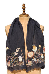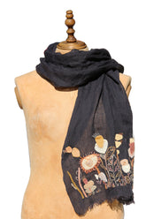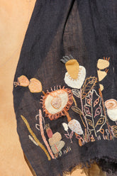 A garden of pretty embroidered flowers decorate the hem of this soft linen scarf. Sophie has been described as a master colourist, evident in the beautiful hand-dyed shades in this piece.